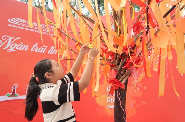 Một học sinh tham gia hoạt động gắn lời nhắn lên cây nguyện ước.