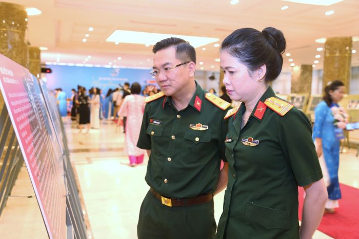 Các đại biểu tham quan triển lãm về “Cuộc đời và sự nghiệp của người Lãnh đạo Hội xuất sắc, Nữ tướng đầu tiên của Quân đội Nhân dân Việt Nam, Anh hùng Lực lượng vũ trang Nhân dân – Nguyễn Thị Định”