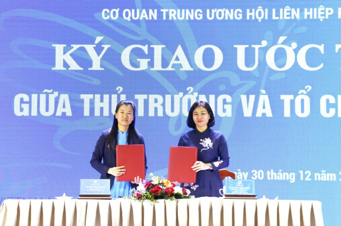 Bà Nguyễn Thị Tuyến (phải ảnh), Ủy viên BCH TW Đảng, Chủ tịch Hội LHPN Việt Nam và bà Vũ Thị Ngọc Loan, Chủ tịch Công đoàn cơ quan TW Hội LHPN Việt Nam ký giao ước thi đua giữa Thủ trưởng và tổ chức Công đoàn