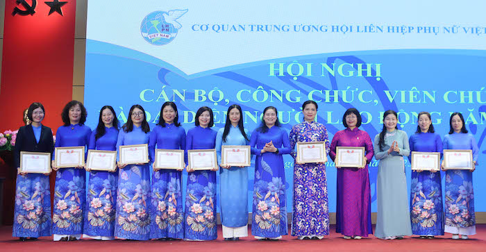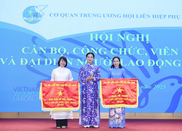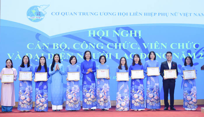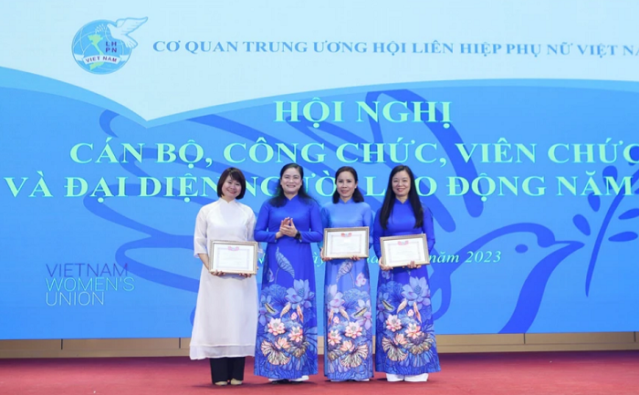 Uỷ viên dự khuyết TƯ Đảng, Phó Chủ tịch Hội LHPN Việt Nam Tôn Ngọc Hạnh và Phó Chủ tịch Thường trực Đỗ Thị Thu Thảo trao Bằng khen cho các cá nhân có thành tích xuất sắc năm 2023.