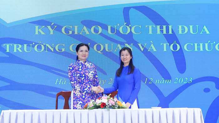Ủy viên BCH Trung ương Đảng, Chủ tịch Hội LHPN Việt Nam Hà Thị Nga và bà Vũ Thị Ngọc Loan, Chủ tịch Công đoàn cơ quan ký giao ước thi đua giữa Thủ trưởng cơ quan và tổ chức công đoàn.