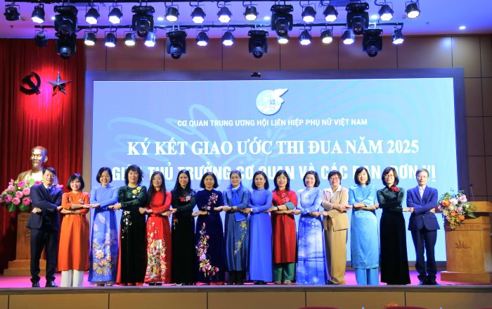 Ủy viên BCH TW Đảng, Chủ tịch Hội LHPN Việt Nam Nguyễn Thị Tuyến (thứ 7 từ trái qua) và các Phó Chủ tịch Hội LHPN Việt Nam cùng lãnh đạo các ban, đơn vị ký kết giao ước thi đua năm 2025